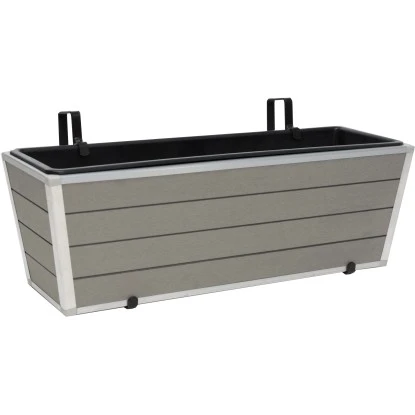 Der Balkonkasten in Hellgrau ist konisch, zum Aufhängen und mit einem herausnehmbaren Kunststoffeinsatz. Ein moderner Balkonkasten der in Verbindung mit Ihrer Pflanzidee ein Highlight in Ihrem Haus oder Garten wird. Das Pflanzgefäß besteht aus einem Verbundstoff von Holz und Kunststoff (WPC) und verfügt über einen wasserdichten Pflanzeinsatz aus Polypropylen. Durch das neutrale Grau und den rostfreien Aluminiumrahmen ist der Pflanztopf zeitlos, modern. Kombinieren Sie diesen schönen Pflanztopf mit andere Größen zu einer ansprechenden Gruppe. Somit haben Sie einen stabilen Behälter für Pflanzen, der auch optisch lange Zeit überzeugt.