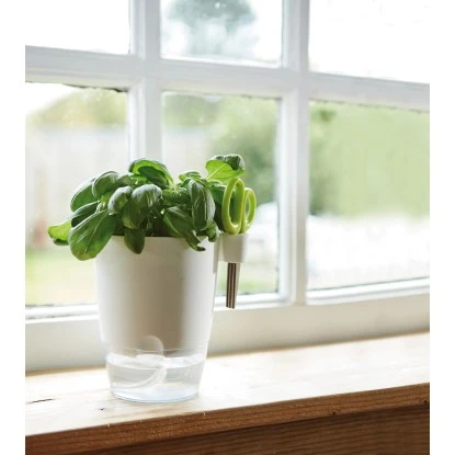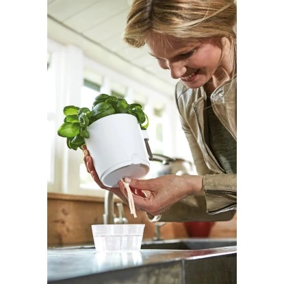 Der Elho Kräutertopf Brussels Herbs All-in 1 besticht durch sein modernes und klares Design. Mithilfe des praktischen Bewässerungssystems dieses Kräutertopfes wird die Pflanze automatisch mit genau der richtigen Menge Wasser versorgt. Der Wasserbehälter ist durchsichtig. So sehen Sie sofort, ob Sie nachgießen müssen. Mit der praktischen Kräuterschere lassen sich schnell mal ein paar Kräuter abschneiden: So kommt noch mehr Geschmack und Aroma in alle Ihre Gerichte.