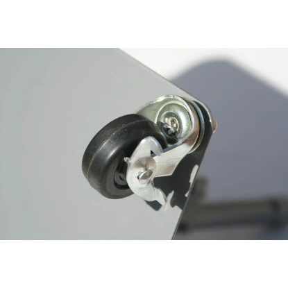 Die rollbare Paravent Fußplatte ist mit 4 Rollen ausgestattet, die sich jeweils um 360° drehen. 2 Rollen sind feststellbar. Zur Verbindung mit dem Paravent hat die Fußplatte ein Senkrechtrohr mit 2 Verbindungs-Clips.