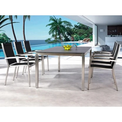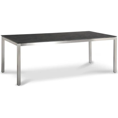– Der Tisch bietet durch die sehr stabile Beinkonstruktion aus elegantem Edelstahl (Qualität V 304) ein interessantes und modernes Design. Die bruchsichere HPL-Schichtstoffplatte (12 mm) mit marmoriertem Dekor Ardesia ist äußerst robust und kratzfest. Die Beinkonstruktion bewirkt zudem eine hervorragende Standfestigkeit. Witterungs- und UV-beständig.