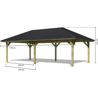 Der rechteckige Pavillon Hedemark 2 hat ein Außenmaß von 359 cm x 706 cm und ein Dachstandmaß von 431 cm x 778 cm. Die Seitenhöhe beträgt 196 cm, der First misst 315 cm. Das formschöne Walmdach wird von 6 Pfosten gestützt, die jeweils 11,5 cm x 12 cm stark sind. Die Pfosten und weiteren Sparren Querverbinder sind kesseldruckimprägniert und somit gegen Witterungseinflüsse bestens geschützt. Wir empfehlen die Verwendung von passenden H-Ankern mit einer Länge von 60 cm für die Befestigung im Untergrund.