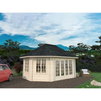 Palmako Holz-Pavillon Hanna 20,3 m² aus 44 mm Blockbohlen mit winddichter Chaletschnitt-Eckverbindung und werkseitig vorgefertigte Dachelemente für einfache Montage. Die stabile, teilverglaste Doppeltür mit Leimholzrahmen und Zylinderschloss hat niedrige, mit Edelstahl abgedeckte Türschwelle. Die Doppeltür mit Seitenelemente und nach Außen öffnende Doppelfenster haben Gummidichtungen, Doppelverglasung und aufgesetzte Sprossen. Zum Bausatz gehören auch imprägnierte Fundamenthölzer, vorgefertigte Dachelemente aus 16 mm Dachbrettern, 19 mm Fußbodenbretter mit Nut und Feder, Sturmleisten, sowie Montageset. Dachbedeckung ist nicht im Lieferumfang enthalten.