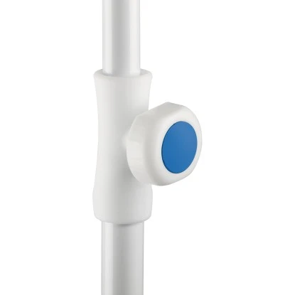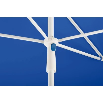Das Gestell ist weiß pulverbeschichtet, hat einen 2-teiligen Stock mit einem Durchmesser von ca. 22/25 mm und schließt mit einem formschönen Top ab. Durch den Schieber mit Taste ist ein leichtes und angenehmes Öffnen bzw. Schließen des Schirmes möglich. Zudem verfügt der Schirm Ibiza über einen Drehfeststeller mit dessen Hilfe Sie die Höhe problemlos nach Bedarf verstellen können. Alle Kunststoffteile, wie das Top, der Schieber und der Drehfeststeller bestehen aus weißem Kunststoff, welches dem Gestell angepasst ist. Außerdem besitzt der Schirm einen Knicker, wodurch dieser entsprechend der Sonneneinstrahlung ausgerichtet werden kann.
