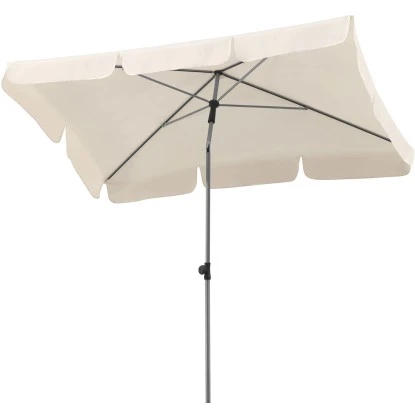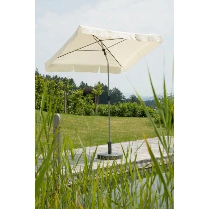 Die Bespannung ist verrottungsfest und verfügt über eine Stoffstärke von ca. 160 g/m². Der Bezug verfügt außerdem über einen Volant, der mit einer Bandeinfassung abgeschlossen ist. Aufgrund der wasserabstoßenden Imprägnierung, hält die Bespannung auch einem leichten Schauer stand und ist im Nu wieder getrocknet. Der Schirm Locarno verfügt über den Lichtschutzfaktor 50+. Somit wird Ihnen mit diesem Produkt ein ausgezeichneter Sonnenschutz geboten. Das Gestell ist silbergrau pulverbeschichtet, besitzt einen 2-teiligen Stock mit einem Durchmesser von ca. 22/25 mm und schließt mit einem formschönen Kugeltop ab. Durch den großen Schieber mit Taste ist ein leichtes und angenehmes Öffnen bzw. Schließen des Schirmes möglich.