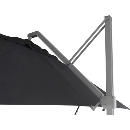 Der Mast und die Streben des Schirms aus leichtem, aber stabilem Aluminium überzeugen mit höchster Verarbeitungsqualität. Dank des Mastdurchmessers von 78 mm hält er auch widrigsten Witterungsbedingungen problemlos stand. Die widerstandsfähige Bespannung aus 100 % Polyester-Gewebe (240 g/m²) ist robust, abnehm- und waschbar und zeichnet sich zudem durch eine vorzügliche Lichtechtheit aus, wodurch das Material auch bei starker Sonneneinstrahlung nicht ausbleicht. Dank des Lichtschutzfaktors von UV 50+ können Sie die Sonnentage unbeschwert genießen.