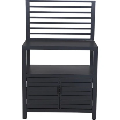 Das Gestell und die Flächen sind aus Aluminium pulverbeschichtet in der Farbe matt anthrazit. Das Outdoor Kitchen Mittelteil hat die Maße von ca. L: 90 cm x B: 56 cm x H: 90 cm. Das Material ist witterungsbeständig und pflegeleicht.