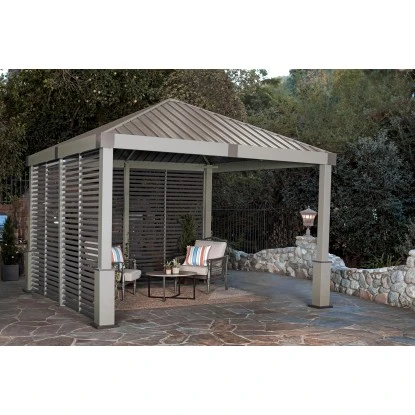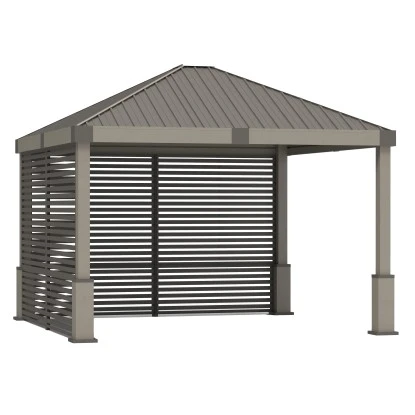 Highlight des Gartenpavillons sind die zwei Seitenwände mit Lamellen: Die schräg gestellten Lamellen aus hochwertigem Aluminium spenden – besonders bei tiefstehender Sommersonne – angenehmen Schatten und sorgen sofort für ein mediterranes Flair. Auch optisch kann sich der Gartenpavillon sehen lassen und fügt sich dank dem edlen, zeitlosen Mix aus champagnerfarbenem Gestell und dem Dach in Taupe in nahezu jeden Garten und Stil ein. Das einzigartige Spitzdach mit Riffelung rundet das stilvolle Gesamtbild ab.